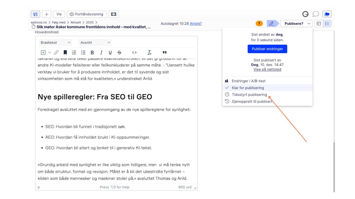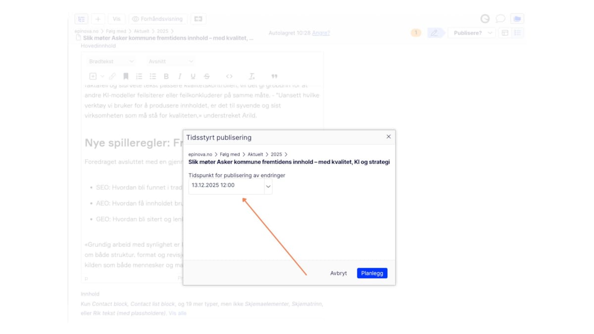 Dette er spesielt nyttig når innhold skal publiseres på et bestemt tidspunkt, for eksempel i forbindelse med kampanjer, lanseringer eller nyheter.